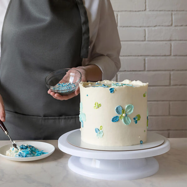 Die Platte lässt sich frei in beide Richtungen drehen, was alle Dekorations- und Konditoreiarbeiten enorm erleichtert. So können Sie beim Verzieren präzise arbeiten oder Ihre Backwaren elegant servieren.